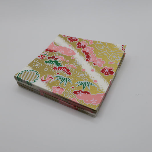 Pack of 100 Sheets 7x7cm Yuzen Washi Origami Paper HZ-373 - Cherry Blossom & Pine Needles Lemon