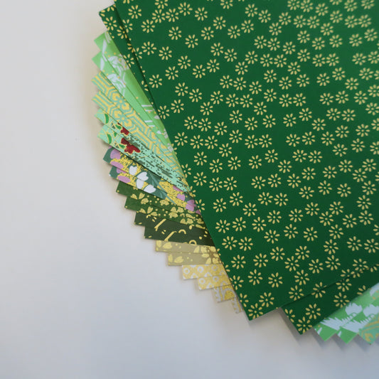 20 Sheets Green & Gold Themed Colours Yuzen Washi Origami Paper Mixed Patterns 14x14cm