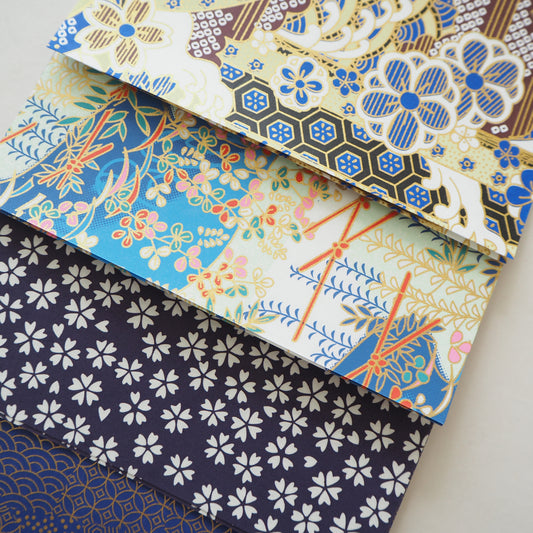 Yuzen Washi, also known as Japanese Chiyogami paper, is inspired by nature and classic kimono patterns. Delicately thin yet durable, it has a soft, flexible feel. Available in 7cm, 9cm, and 14cm, each sheet is screen printed, often finished with subtle gold or silver accents.