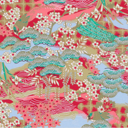 Paquete de 20 hojas de papel para origami Yuzen Washi de 14x14 cm HZ-502 - Rojo flor de cerezo dorado pequeño