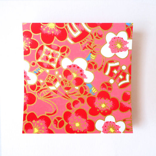 Paquet de 100 feuilles de papier origami Yuzen Washi 7x7 cm HZ-413 - Fleurs de prunier rouge blanc or