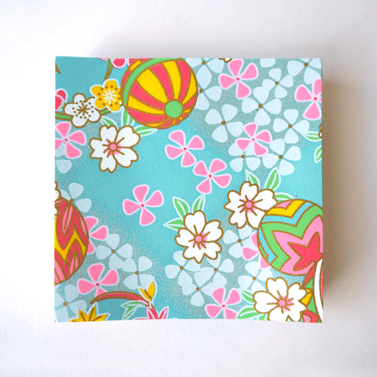 Paquet de 100 feuilles de papier origami Yuzen Washi 7x7 cm HZ-283 - Boules de fil Temari et fleur de cerisier bleu aqua