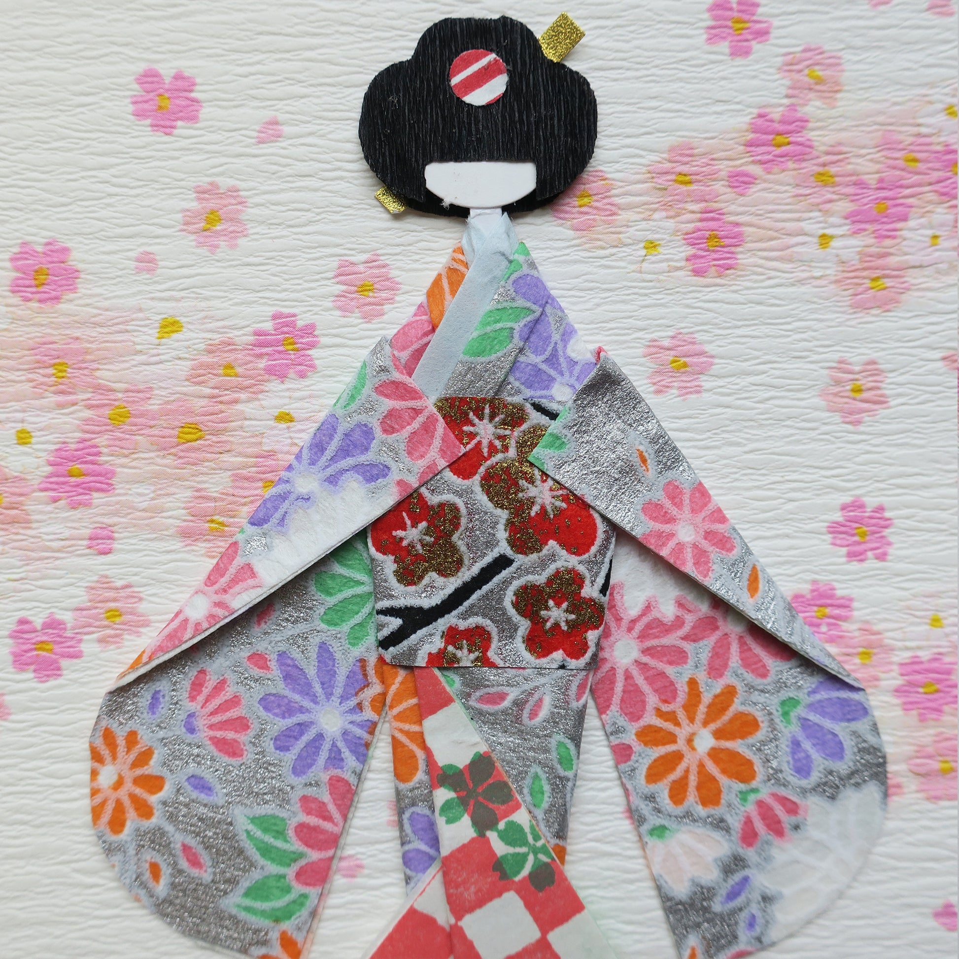 The dolls are crafted from vibrant Yuzen Washi (traditional patterned paper), giving them a 3D, handcrafted texture.