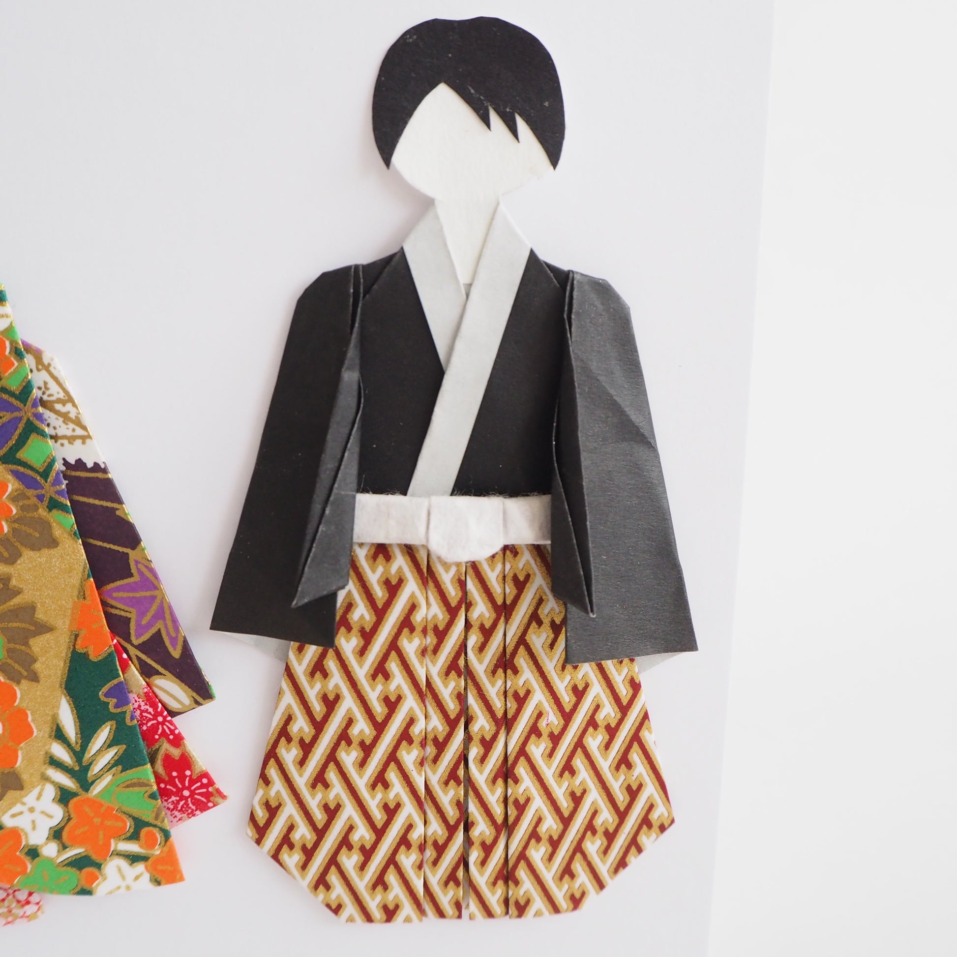 The dolls are crafted from vibrant Yuzen Washi (traditional patterned paper), giving them a 3D, handcrafted texture.